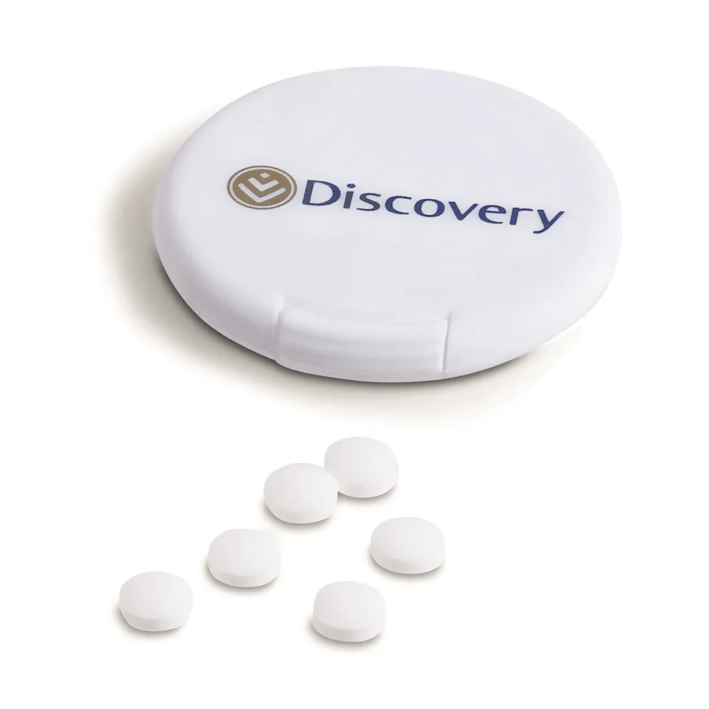 Our affordable round mint dispensers with peppermint-flavoured sugar-free mints- great giveaways for any promotional event. Large branding area for your logo.